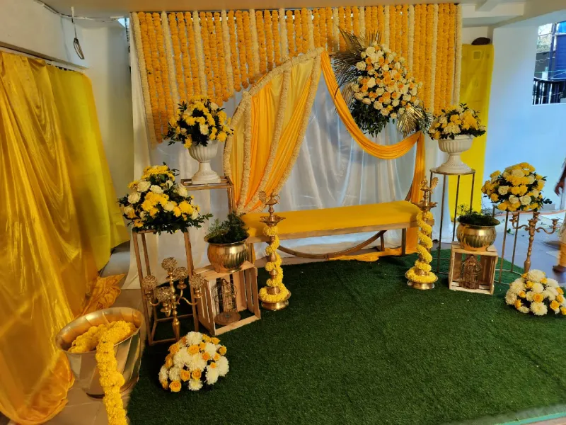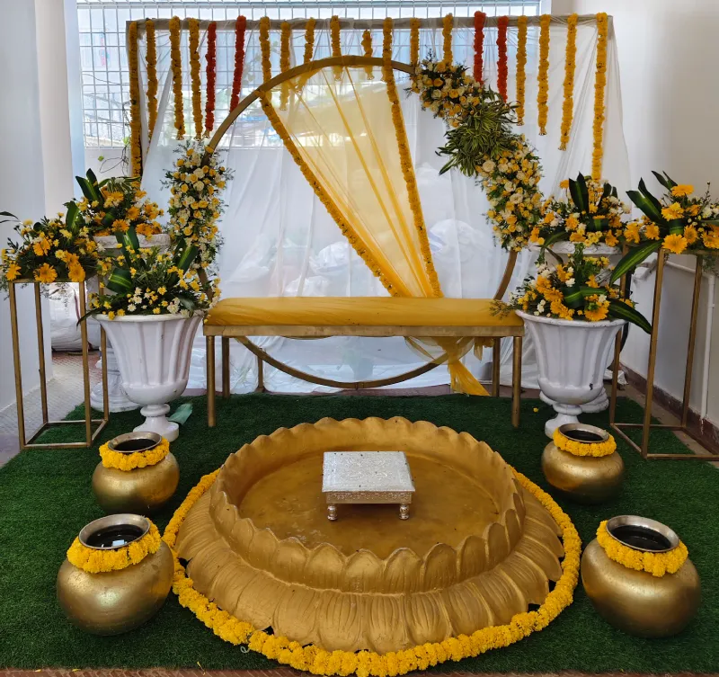 Yellow drapes, floral highlights, and elegant floor styling with props and candles. Perfect when you want a classy indoor Haldi stage.
