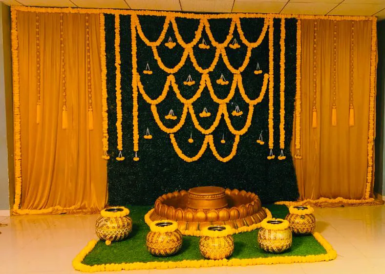 A rich green backdrop with layered marigold loops and hanging diyas, finished with a traditional haldi kund and brass pots for a proper festive vibe.