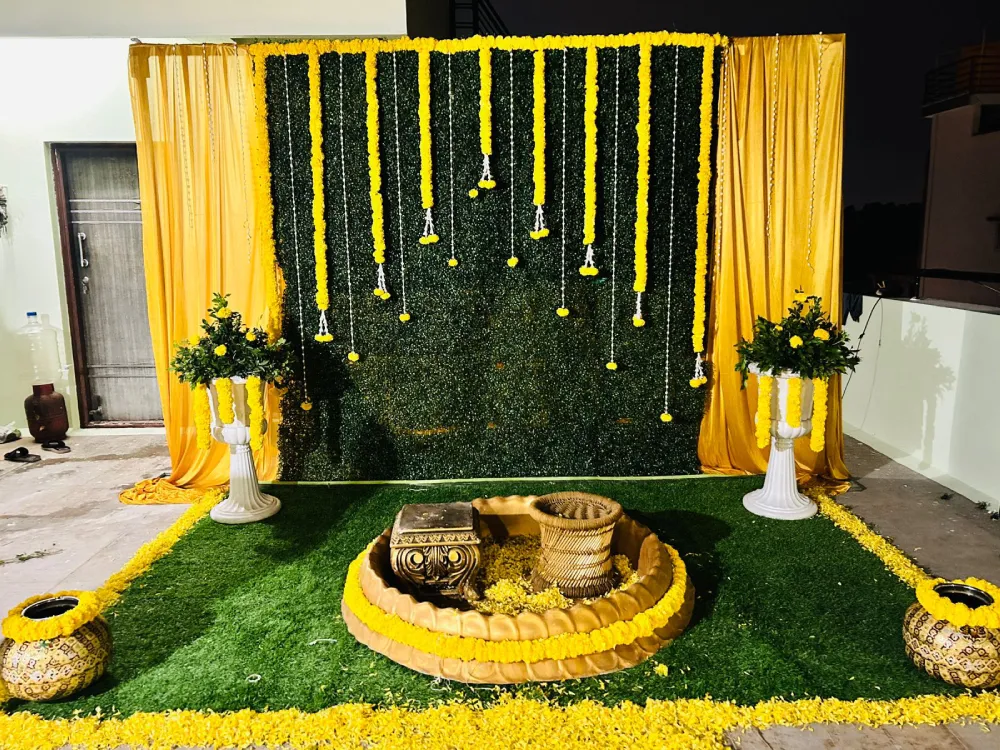 A compact green-wall design with hanging marigold tassels and side drapes, styled for smaller spaces while still looking premium in night photos.