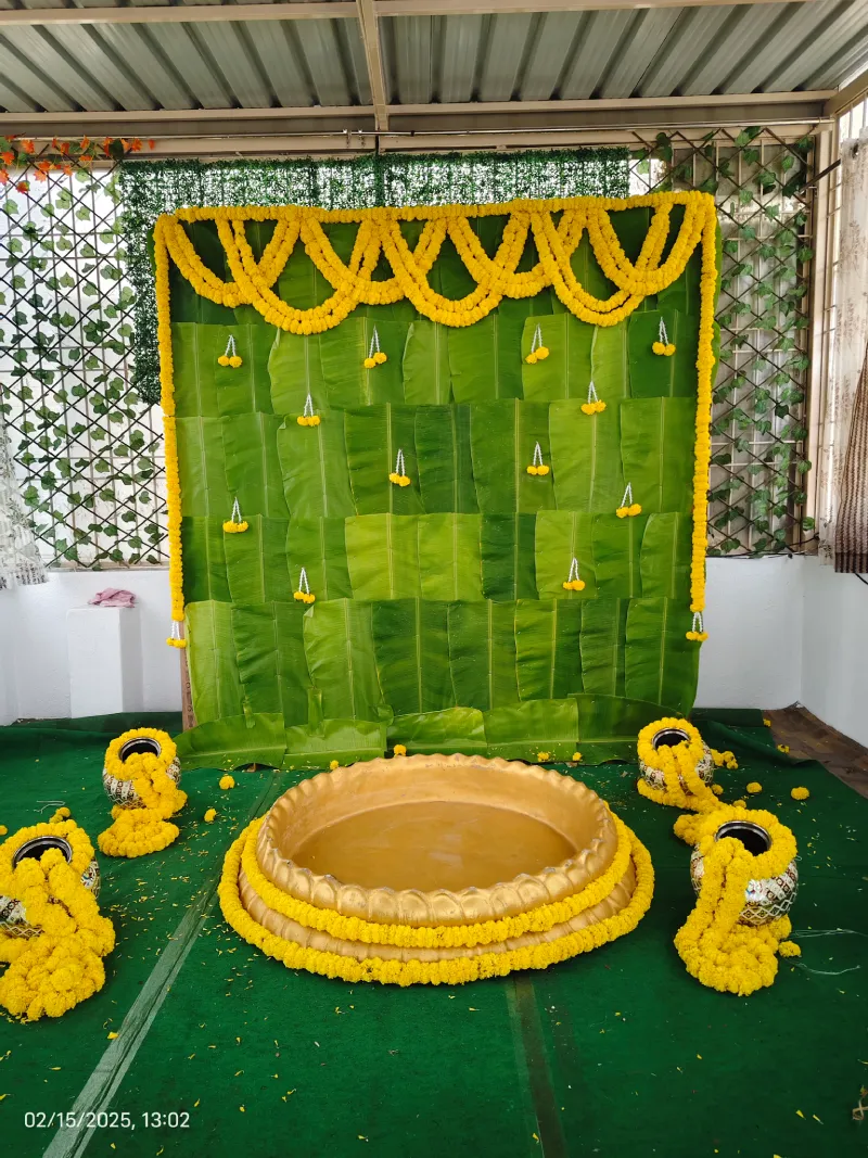 A simple, authentic South Indian-style setup using banana leaves, marigold swags, and minimal décor. Ideal for home functions and intimate ceremonies.
