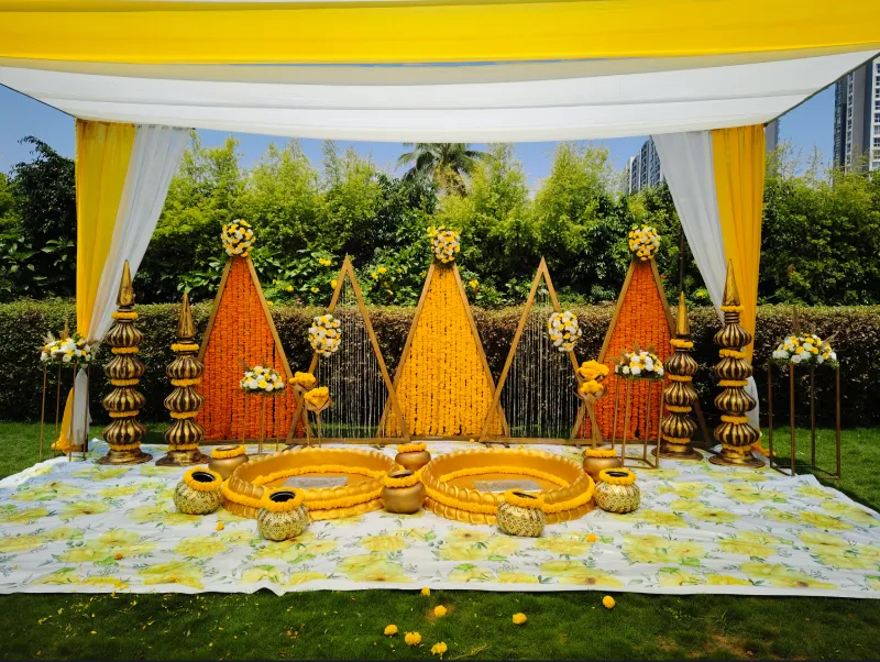 Made for lawns and open venues, with bright yellow-white drapes, marigold elements, and traditional seating + kund placement for a grand outdoor look.