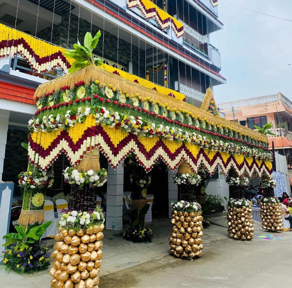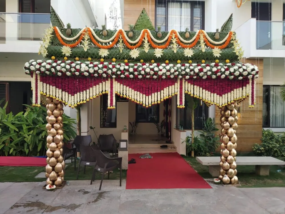Premium entrance décor featuring coconut pillars, banana stems, and floral detailing. Brings a rich, auspicious look to independent houses and villas.
