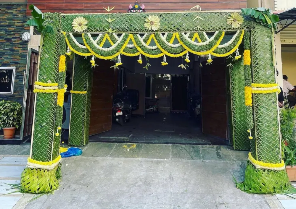 A beautifully lit entrance setup with green leaves, floral garlands, and warm lighting. Ideal for evening griha pravesh and house warming poojas.