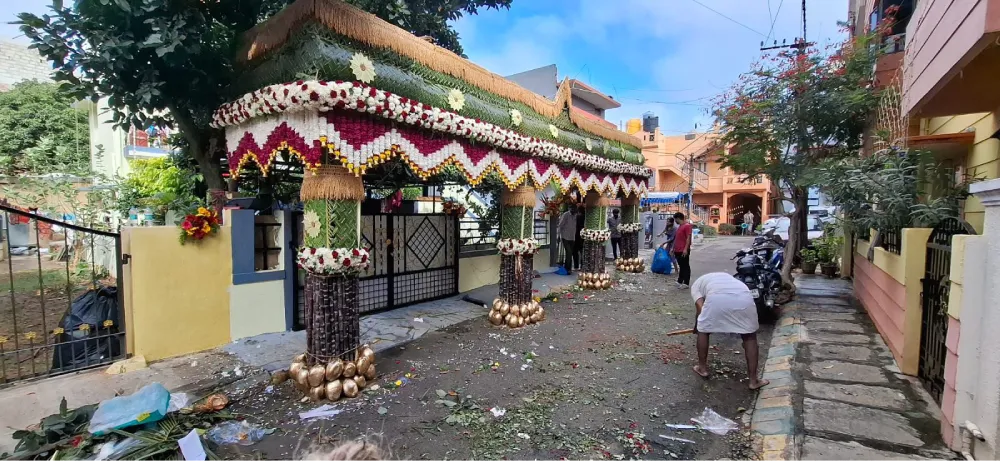 A classic South Indian house warming setup using fresh banana leaves, mango leaf torans, and floral hangings. Ideal for griha pravesh and vastu-compliant ceremonies.