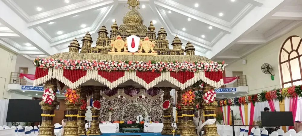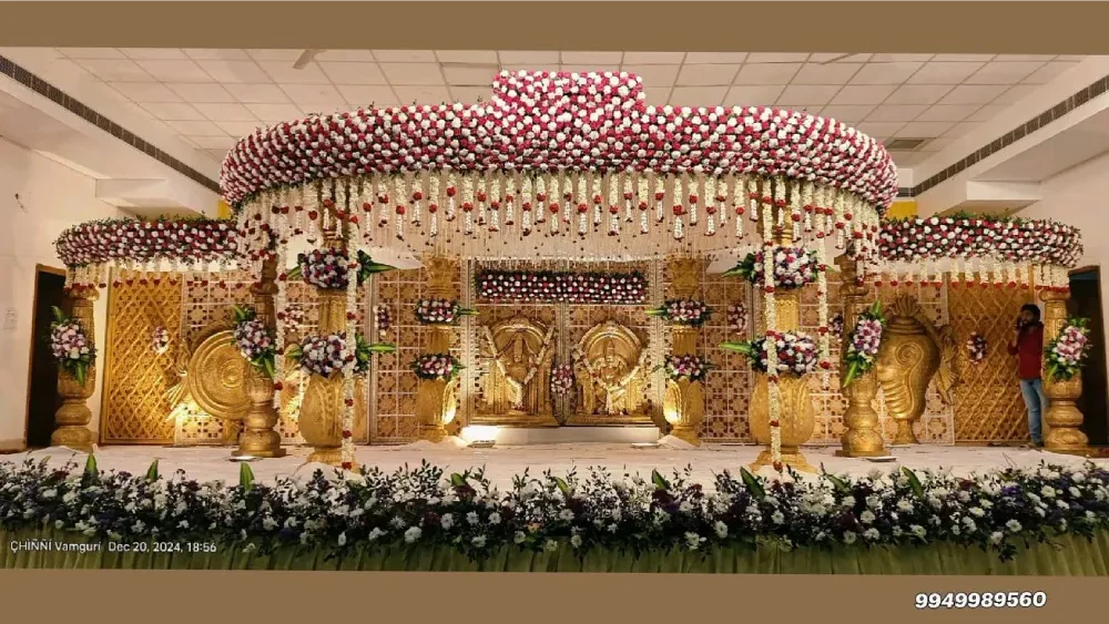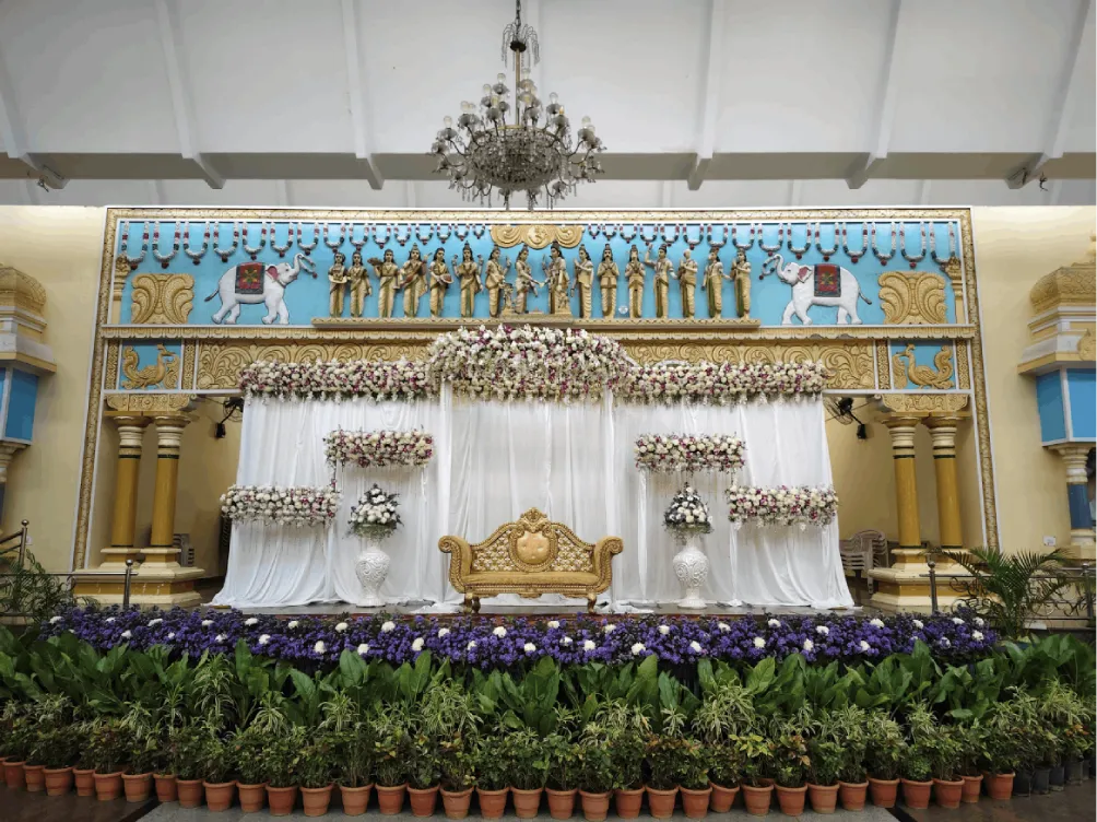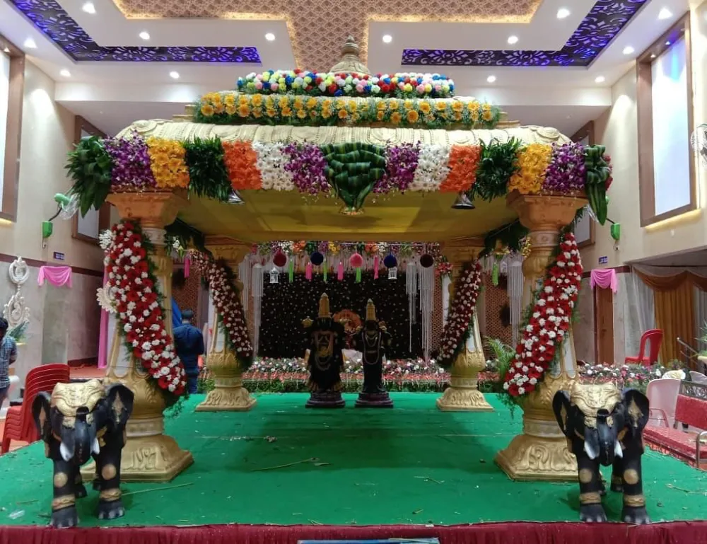 A richly detailed mandap featuring temple carvings, deity symbols, and red–white floral drapes. Ideal for traditional South Indian and Vaishnavite weddings.