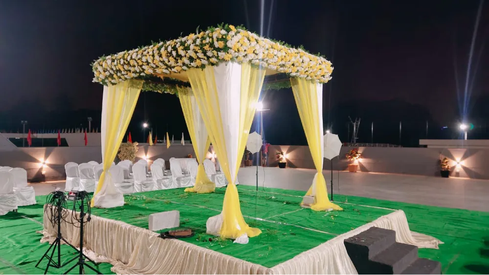 A minimal yet elegant mandap with ivory drapes, soft yellow lighting, and floral roofing. Best suited for intimate night weddings and terrace ceremonies.